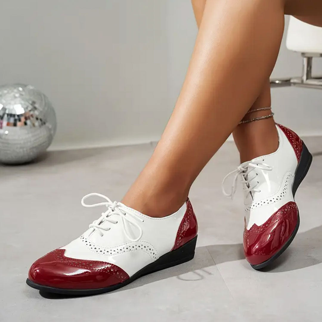 Crafted with a glossy patent finish, this two-tone oxford silhouette is decorated with classic brogue perforations and set on a low-profile foam-cushioned sole, blending vintage elegance with modern, all-day comfort.